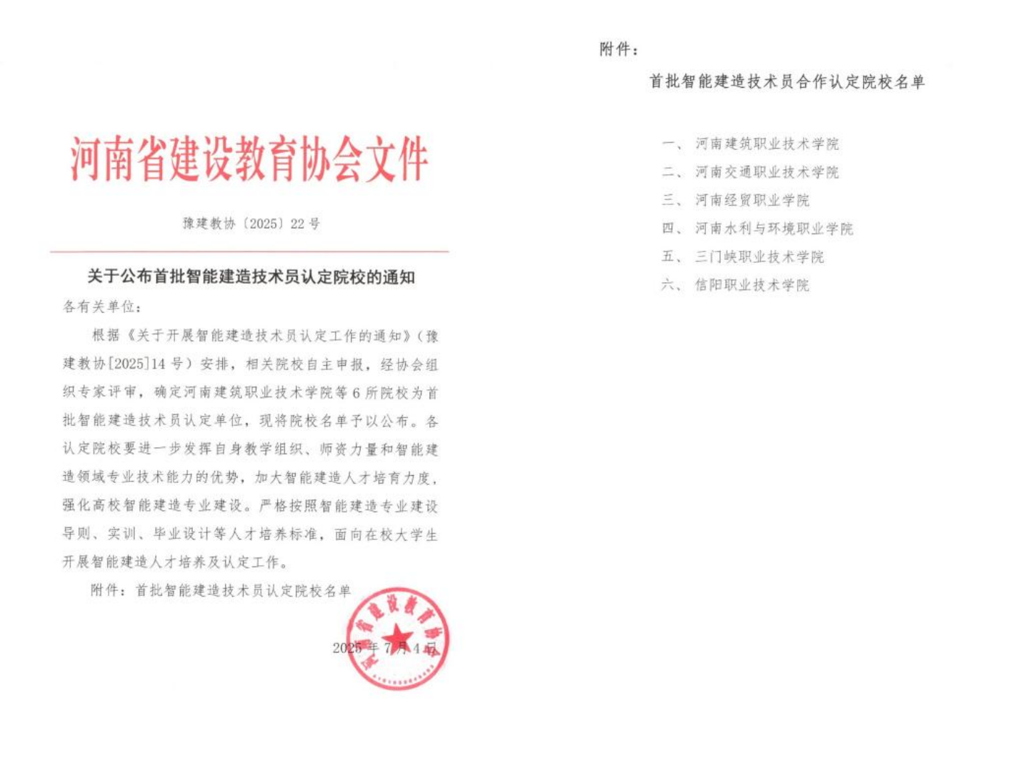 河南省建设教育协会近日发布《关于公布首批智能建造技术员认定院校的通知》(豫建教协〔2025〕22号),学院凭借其在智能建造领域的前瞻布局、深厚积淀与创新实践,成功入选河南省首批智能建造技术员认定院校。这标志着学院作为豫西智能建造人才培养高地,在服务区域建筑业数字化转型、输送高素质技术技能人才上迈出关键一步。