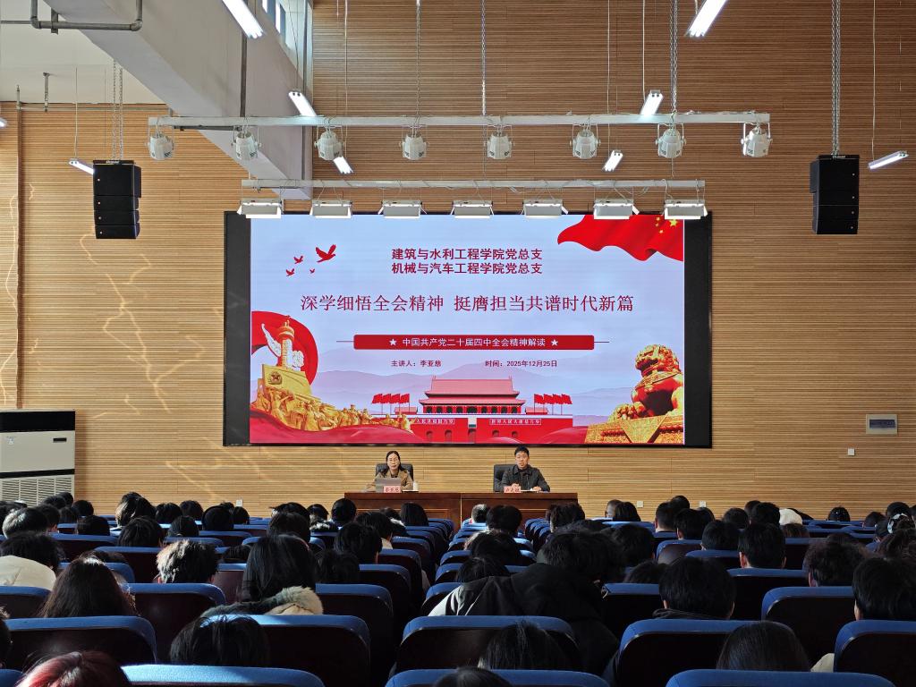 为学习宣传贯彻好党的二十届四中全会精神,12月25日,澳门网投官方网站和机械与汽车工程学院在5137学术报告厅联合举办党的二十届四中全会精神集中宣讲。学院思政教师宣讲团成员李亚慈副教授应邀作专题报告,澳门网投官方网站和机械与汽车工程学院师生党员参加此次活动,活动由澳门网投官方网站副书记卢克斌主持。