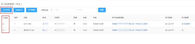 学生在出发去实习企业时、学生在完成实习任务时以及学生实习需要延期时,需要指导老师在此处完成实习进度更新。指导老师可以一次选择多个实习小组或多个实习学生进行批量处理。