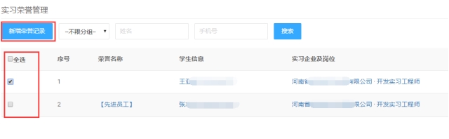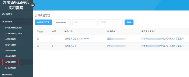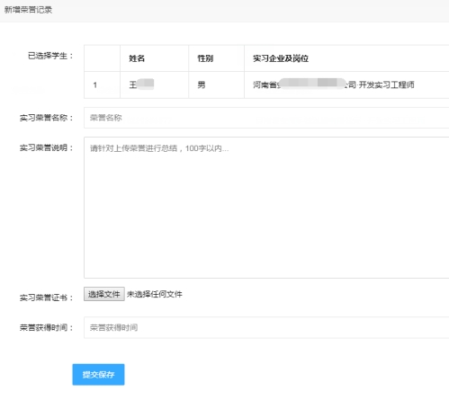 点击【实习荣誉管理】,选择要添加实习荣誉的学生,点击【新增荣誉记录】,输入荣誉名称、荣誉说明和获得时间,上传荣誉证书照片文件,点击【提交保存】,完成新增荣誉操作。
