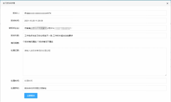点击【实习投诉管理】操作栏的【处理】处理学生的投诉信息,处理之后的数据只能点击【查看】查看学生的投诉信息和处理情况。