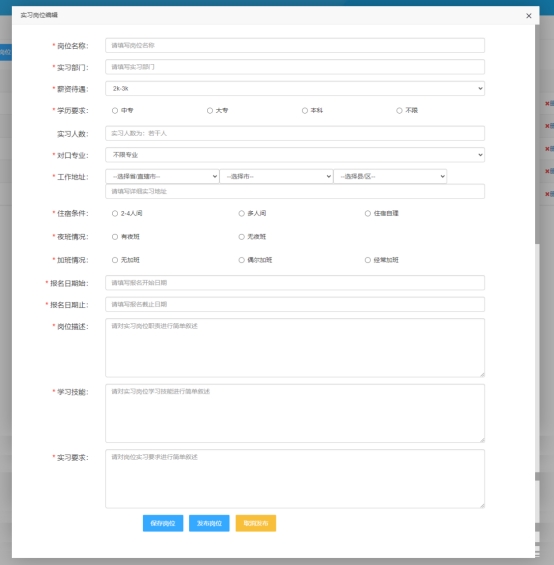 企业在实习备案模块发布实习信息,包括岗位描述,薪资待遇,住宿条件,学习技能,工资结算方式等。