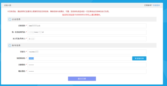 没有学校推荐录入,企业也可以自行注册账号,称为自荐,按照界面要求填写企业信息和账号信息。企业信息包括企业的名称、统一社会信用代码和负责人(法人代表);账号信息包括手机号、验证码和密码。输入表单内容点击【发送验证码】,将验证码填写后点击【提交注册】完成账号注册。