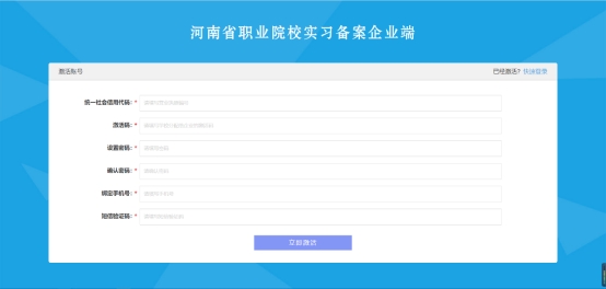 学校推荐录入企业信息后,企业管理员须激活账号,按照界面要求填写统一社会信用代码、校方提供的激活码、密码、手机号、验证码等内容。点击【发送验证码】,将验证码填写后点击【立即激活】完成账号激活。
