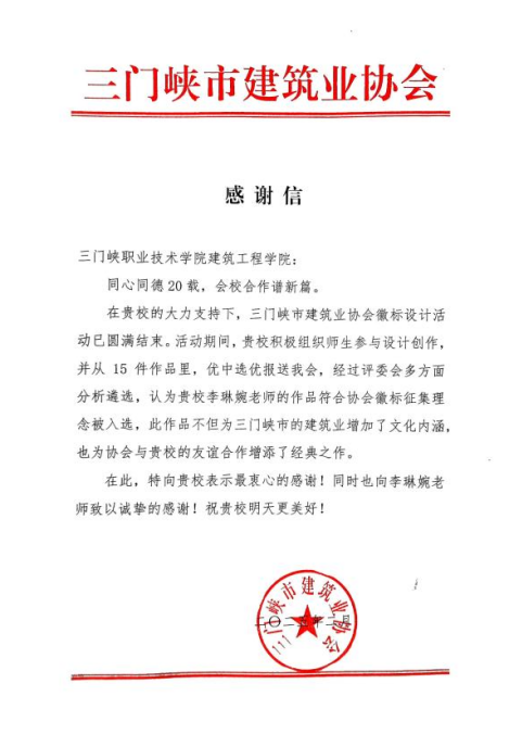 近日,三门峡市建筑业协会向澳门网投官网发来感谢信,对澳门网投官方网站李琳婉老师设计的协会会徽标表示高度认可和衷心感谢。该会徽标从众多设计方案中脱颖而出,被协会正式采纳,成为三门峡市建筑业协会的官方标识。这是澳门网投官网深化产教融合、服务地方经济社会发展的又一重要成果。