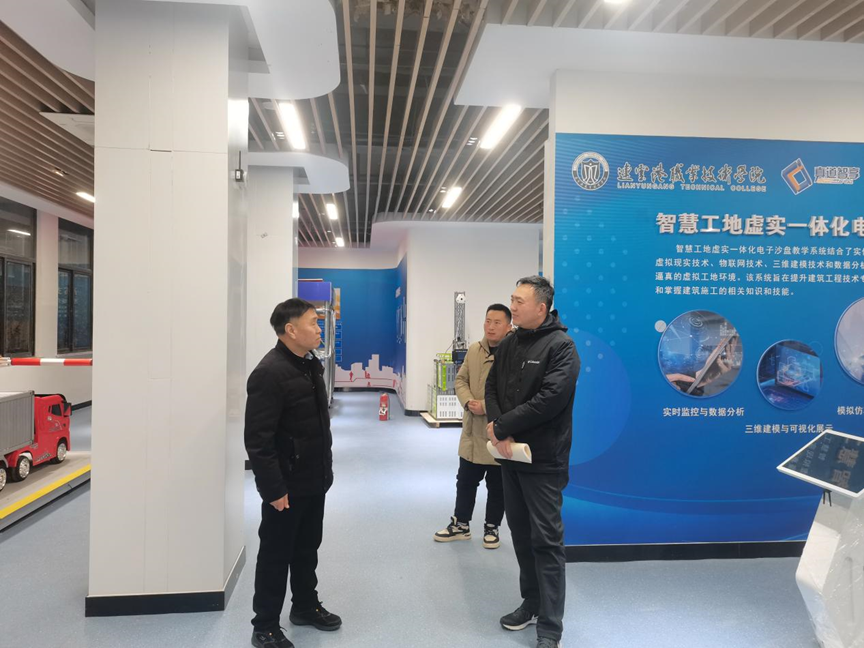 考察组一行先后参观了由真道智享公司在连云港职业技术学院建立的智能建造和装配式建筑实训室,并认真听取赵炜经理的介绍,全方位了解实训室的设计理念和建设思路。后续,张院长深入体验我司研发的BIM+智慧工地数字孪生沙盘产品,为后续澳门网投官方网站相关实训室的建设和优化提供参考。