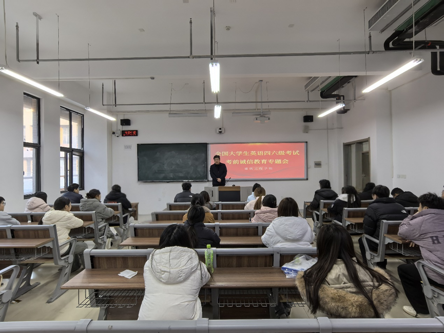 会议第一项,刘欣作动员讲话。他首先强调了全国大学英语四六级考试作为国家级标准化考试的重要性,指出这不仅是对学生英语综合能力的检验,更是对其品德修养与诚信观念的一次考验。刘欣结合近年来考试中出现的违规违纪典型案例及处理结果,深入剖析了考试作弊对个人学业、职业生涯乃至社会诚信体系造成的严重危害,要求全体考生端正态度、杜绝侥幸心理,自觉遵守考试纪律,以真实水平检验学习成果,共同维护国家级考试的严肃性与学院的良好声誉。他还叮嘱同学们合理安排考前时间,认真备考,以平和心态与充分准备迎接考试,并预祝大家取得优异成绩。