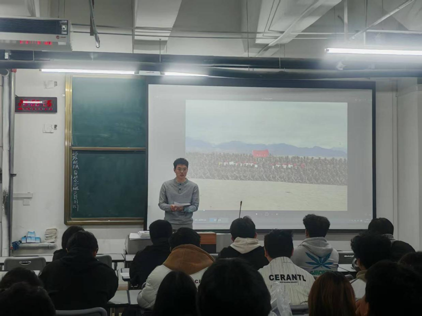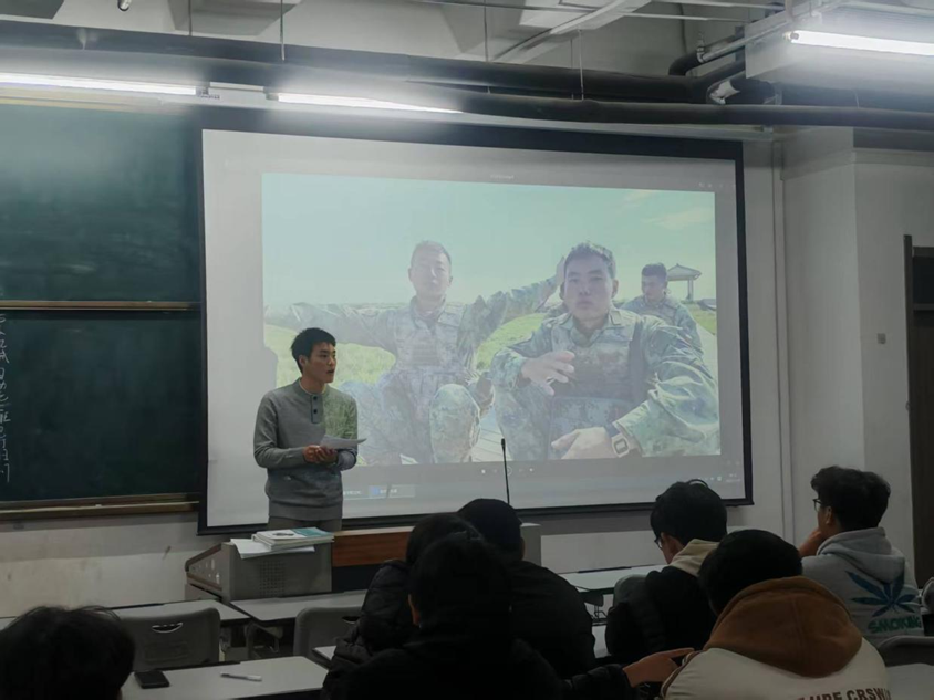 分享会上,退伍战士张鹏飞同学以自主演讲的形式分享军旅生涯的珍贵经历与成长感悟。结合自身在部队的训练、执行任务的点滴故事,讲述了从校园到军营的蜕变。他分享了野外驻训时的艰苦磨砺,诠释“坚持就是胜利”的信念;抢险救灾中的责任担当,传递“人民至上”的初心,展现了“退伍不褪色”的昂扬姿态。字里行间饱含着对军旅生活的眷恋、对青春使命的理解,让在场学子深刻感受到军人的坚毅品格与奉献精神,引起现场学子的纷纷共鸣。