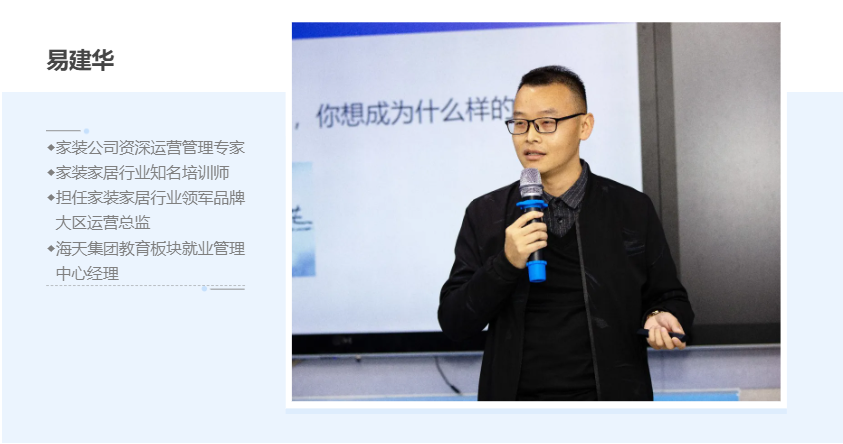 易经理在大讲堂上,向21级海天班同学们详细讲解了校企班的优势与海天校企合作"产教融"倒三角培养模式,并给出了大学三年的学习成长规划。对于20级的学生,易经理讲解了装饰行业自我定位,让学生了解如何成为真正的职业化设计师。