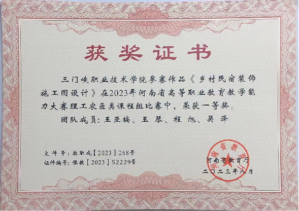 近日,从《河南省教育厅关于2023年河南省高等职业教育教学能力大赛拟获奖名单的公示》中获悉,在2023年河南省高等职业教育教学能力大赛中,澳门网投官网王亚楠、王琴、程旭、吴泽老师的作品《乡村民宿装饰施工图设计》,经校级评比、省级网络评审、现场决赛等环节,取得了省级一等奖的优异成绩。