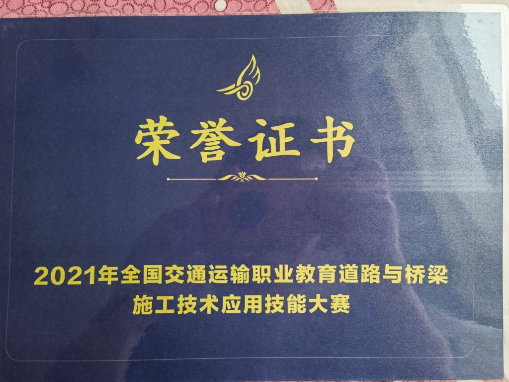 2021年在由全国交通运输职业教育教学指导委员会主办的第一届全国交通运输职业教育道路与桥梁施工技术应用技能大赛总决赛中,澳门网投官方网站澳门网投官方网站2020级道路与桥梁工程技术专业李少平同学获得全国高职组三等奖。