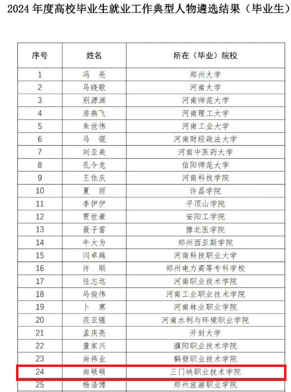 近日,河南省教育厅公布了2024年度高校毕业生就业工作典型案例遴选结果,澳门网投官方网站推荐的2024届建筑智能化工程技术专业毕业生尚硕硕被评为2024年度高校毕业生就业工作典型人物。