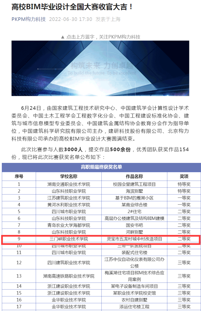 “全国高校BIM毕业设计大赛”由中国建筑科学研究院有限公司主办。此次比赛参与人数3000人,提交作品500余份,优秀团队获奖作品154份,赛项分为本科组和专科组各7个赛项。建筑工程技术(智能建造)专业学生参加了高职组E模块。
