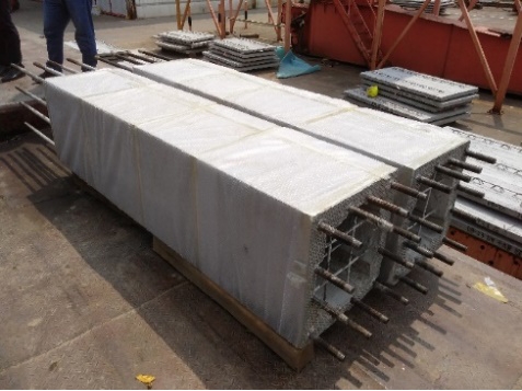 图4 三明治叠合外墙板构件3. 叠合柱。采用模壳的形式,内部放置由焊接箍筋网片和柱纵筋组成的柱成型钢筋骨架,柱的四面浇筑混凝土,模壳既充当钢筋保护层参与受力,又充当后浇筑混凝土模板。