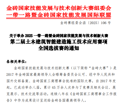 2025年一带一路暨金砖国家技能发展与技术创新大赛第二届土木建筑智能建造施工技术应用赛项全国选拔赛的消息引发了广泛关注。智能建造技术教研室积极响应,迅速行动,全力以赴投入到备赛工作中,力求在这场高规格的国际赛事中展现出卓越的专业实力和精神风貌。
