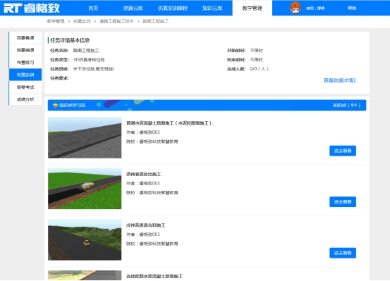道路施工技术虚拟仿真课程采用互联网在线教学实训,通过虚拟仿真的形式将施工工艺流程、施工过程中的人材机的全过程施工进行线上模拟。通过在线实训可解决传统道路实训场地难找、难以全过程实训、不安全、花费大等问题。