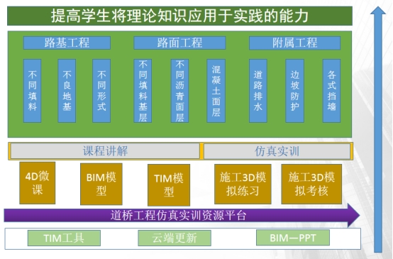 课程内容支持PC端、手机端查看,方便学生使用课程资源。课程可使用个性化功能BIM-PPT,在PPT讲义中便捷调用课程资源,丰富授课内容展现形式,提高学生的学习兴趣。在虚拟施工现场对道路结构进行施工模拟,解决传统实训方式场地难找、隐蔽工程看不到、实训周期长、实训成本高的问题,让学生用较短时间就可理解并掌握道路施工工艺和技术参数。