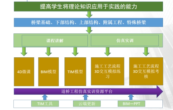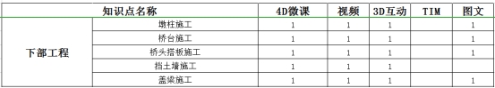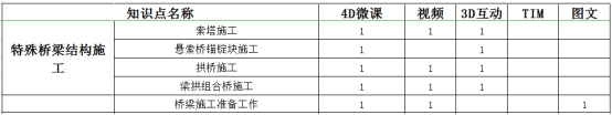 课程包含桥梁基础、下部结构、上部结构、附属四大部分40余知识点,覆盖常规桥梁结构施工的施工工艺和技术参数,在此基础上制作特殊桥型及特殊工法TIM模型,在满足教学广度的前提下,提高教学深度,使学生对桥梁施工有全面的认识。