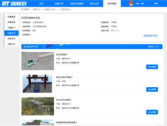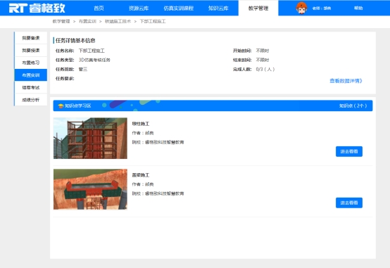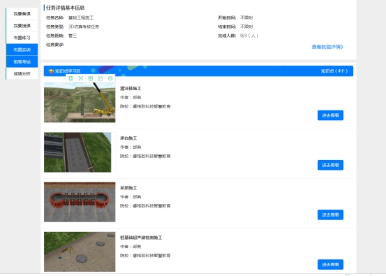 本课程方案包含34个学时的学习内容,通过在线虚拟仿真的形式进行教学。课程内容主要以学生依据技术交底编写、4D微课视频学习、3D互动工艺操作等学习完成施工流程流程考核、工种考核、机具考核、材料考核、规范和位置考核等多样化考核形式,多维度检验学习效果,解决学生实训难,老师考核难、量化难问题。